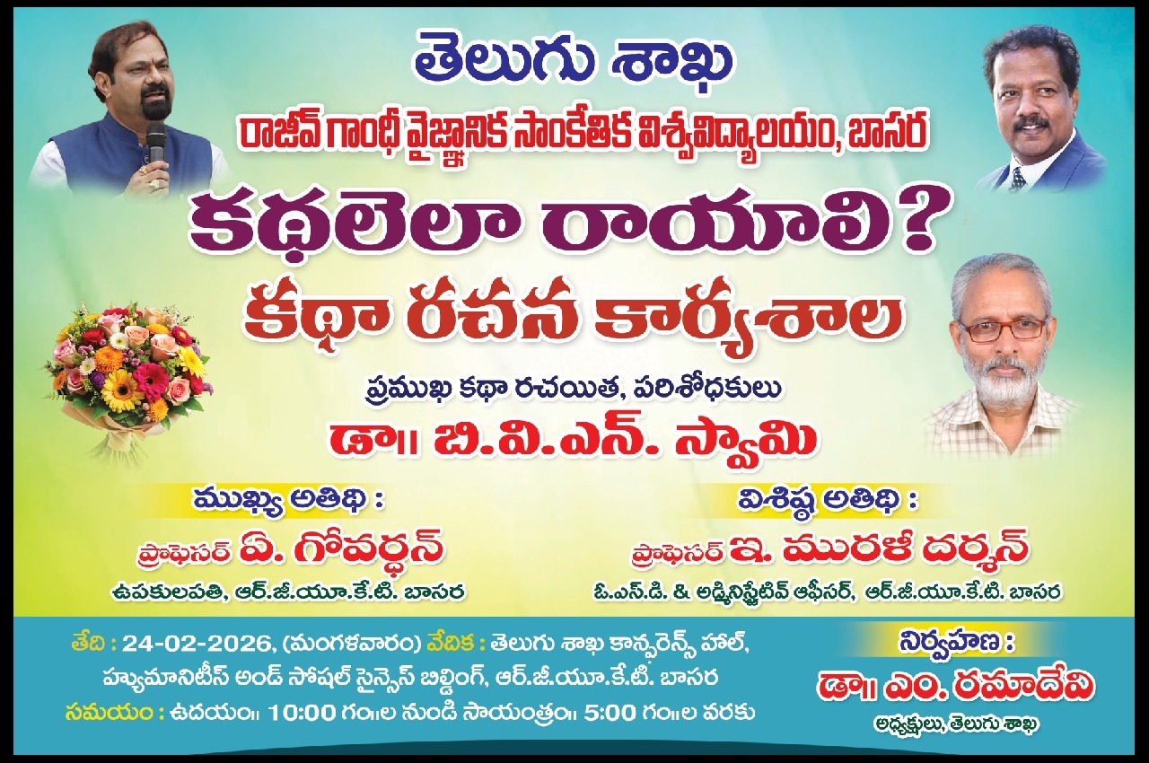 రాజీవ్ గాంధీ వైజ్ఞానిక సాంకేతిక విశ్వవిద్యాలయం (ఆర్.జీ.యూ.కే.టీ.), బాసర లోని తెలుగు శాఖ ఆధ్వర్యంలో జరగనున్న "కథలెలా రాయాలి? - కథా రచనా కార్యశాల" కు మిమ్మల్ని సాదరంగా ఆహ్వానిస్తున్నాము.