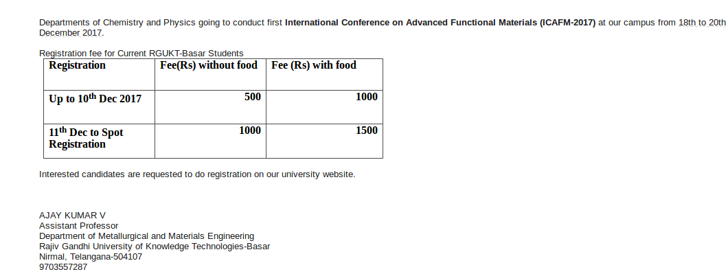 Departments of Chemistry and Physics going to conduct first International Conference on Advanced Functional Materials (ICAFM-2017) at our campus from 18th to 20th December 2017.