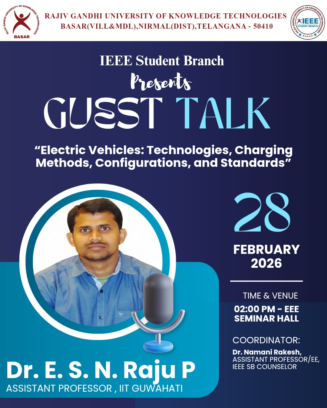The IEEE Student Branch of RGUKT Basar is proud to announce an insightful Guest Talk by a distinguished expert in the field of Power Systems and EV Infrastructure.