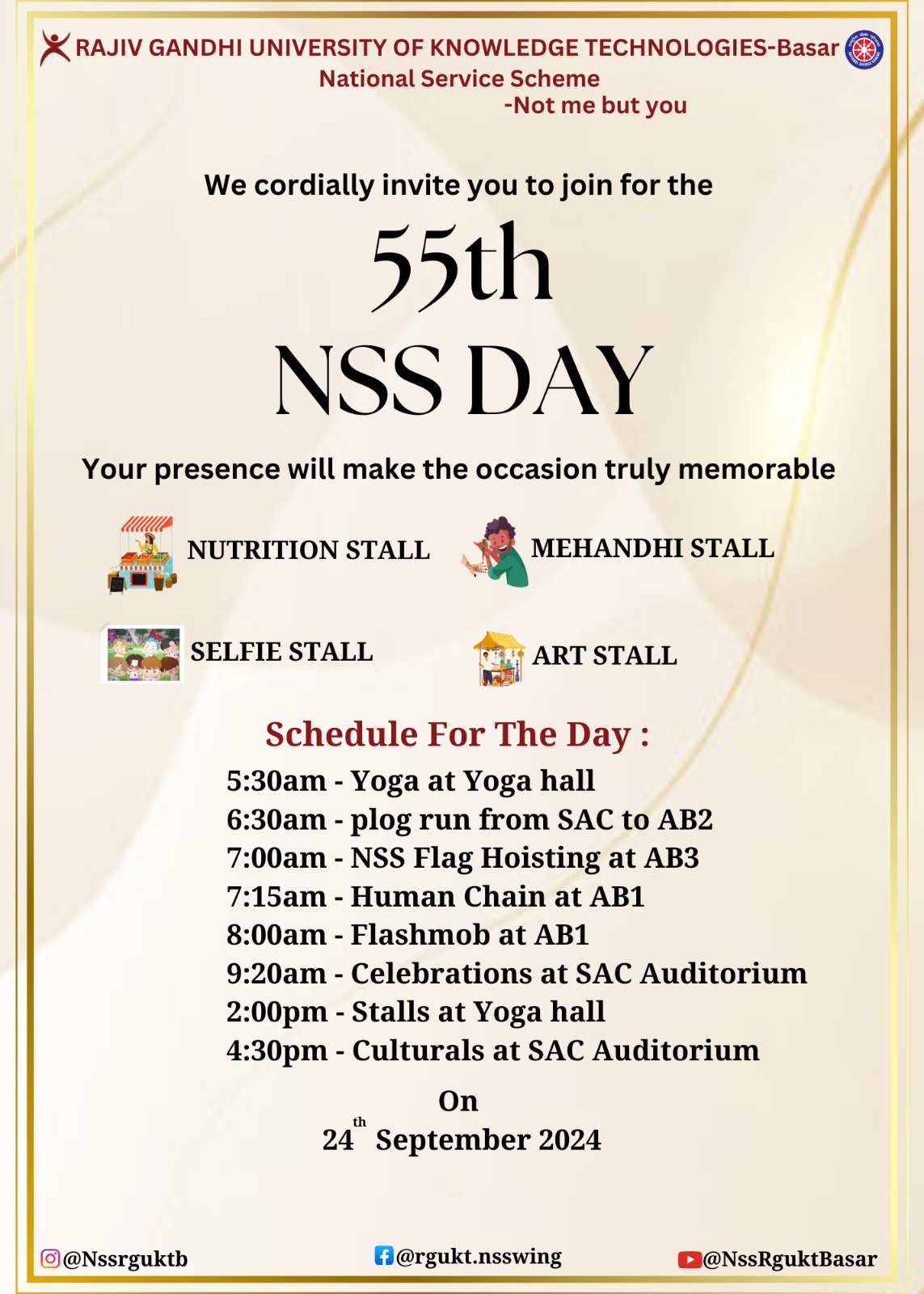 - 9:20 am: Address by Guest of Honor - Smt. Abhilasha Abhinav, IAS & District Collector, Nirmal. District and Addres by Address by Prof. V. Venkata Ramana, Vice chairman, TGCHE, Vice Chancellor RGUKT-Basar and Chairman, NSS Cell RGUKT-Basar