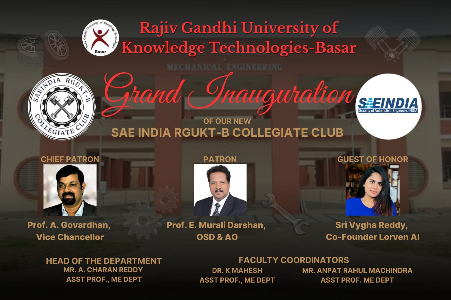 We are delighted to invite you all to the Inauguration of the SAE (Society of Automotive Engineers) Club at RGUKT Basar, scheduled as follows: