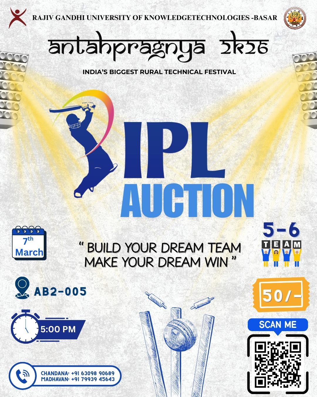 As part of the ongoing activities, we are organizing an IPL Auction Event, where participants will experience the excitement of cricket strategy and the thrill of building their own dream IPL team. In this event, participants will take on the role of team owners, bidding for players in a live auction format. Teams must strategically manage their budget and player selections to build the strongest possible squad. This event is designed to test participants cricket knowledge, strategic thinking, and teamwork while recreating the excitement of an IPL-style auction. Event Details: Team Size: 5-6 members Date: 7th March Time: 5:00 PM Venue: AB2-005 Registration Fee: ₹50 Note: Prize money will be announced for the winning team. Interested students are encouraged to participate and showcase their strategy in building a winning team. Best regards, Organizing Committee Antahpragnya 2K26 RGUKT BasarURL: Click Here