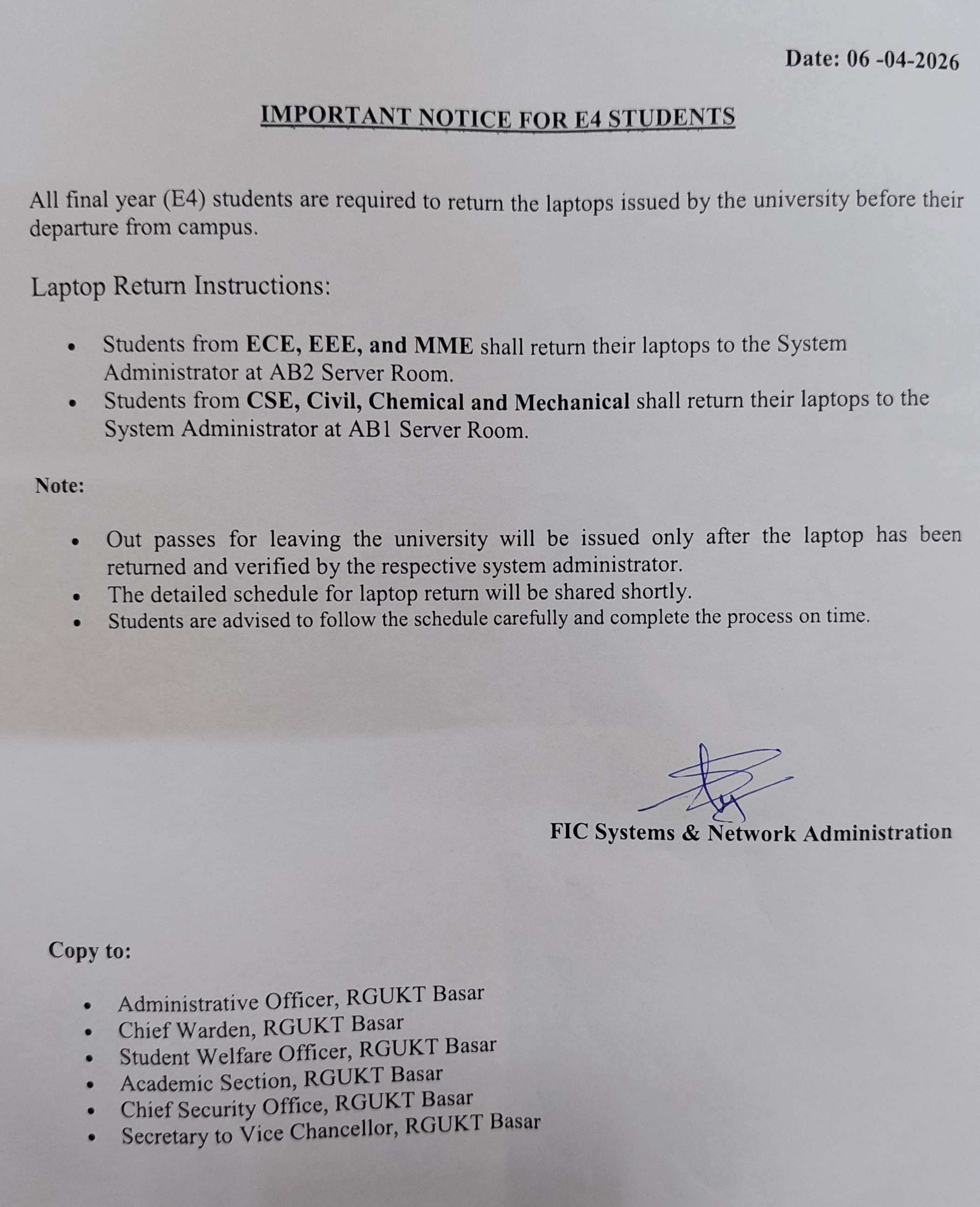 All final year (E4) students are required to return the laptops issued by the university before their departure from campus.