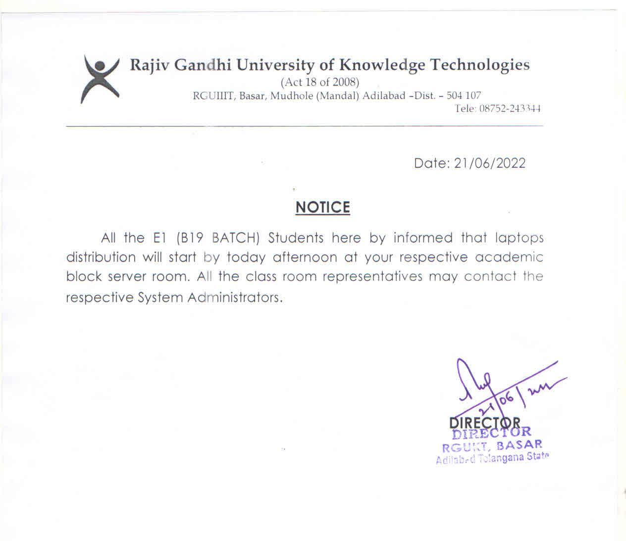 Greeting from Training & Placement, RGUKT, Basar…!