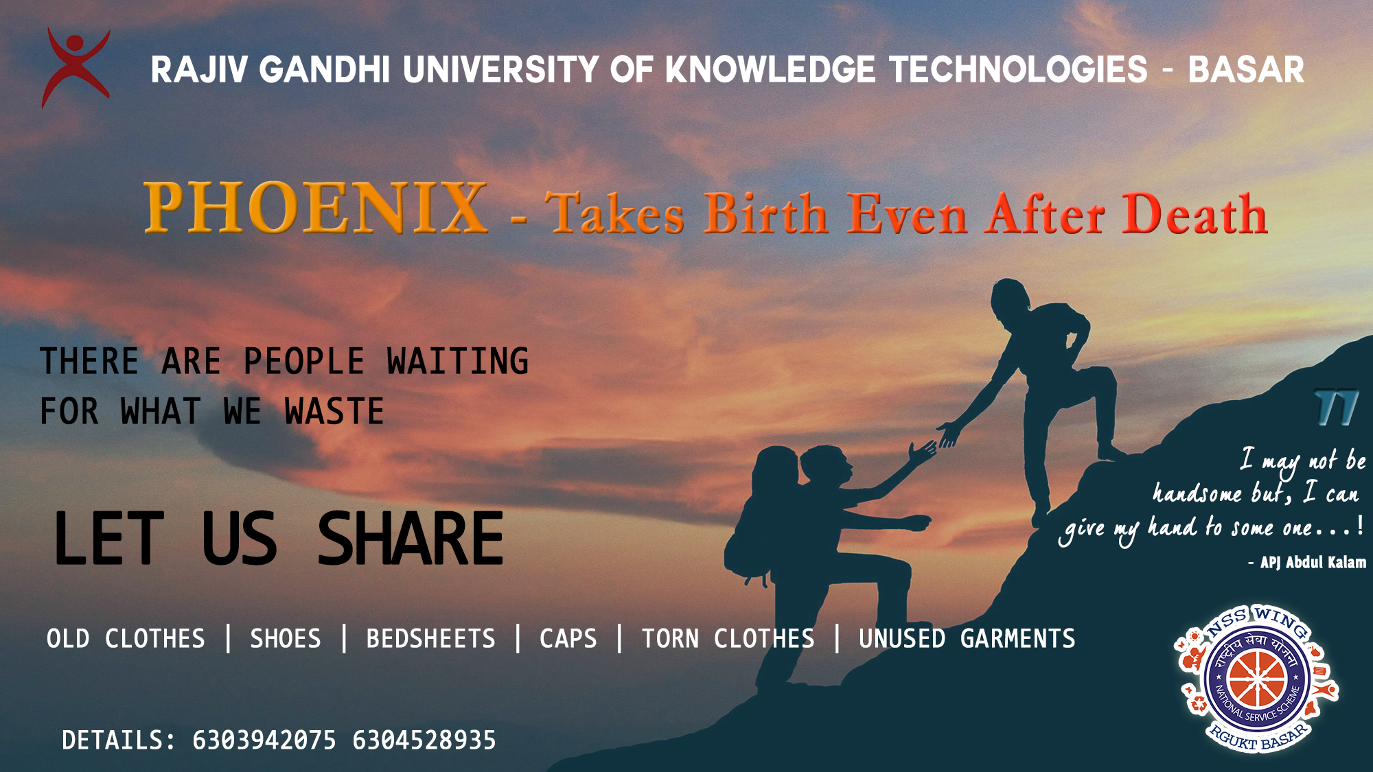 All those who can share their part are expected to drop your sharing clothes in the drop boxes that are made available at hostels/academic blocks etc or can also call to any below mentioned phone number for further assistance.