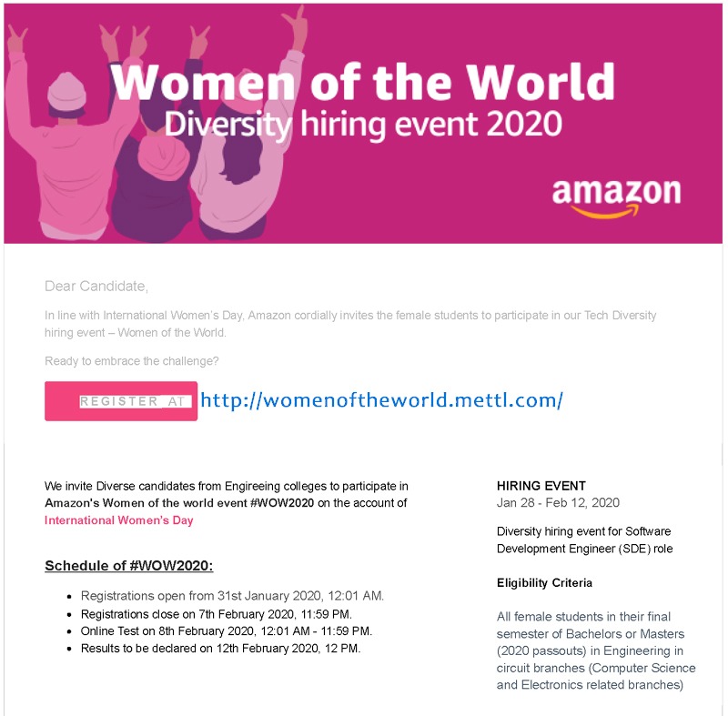 Amazon Conducting recruitment drive for Women. Interested & Eligible students need to register in given link mentioned in notice.