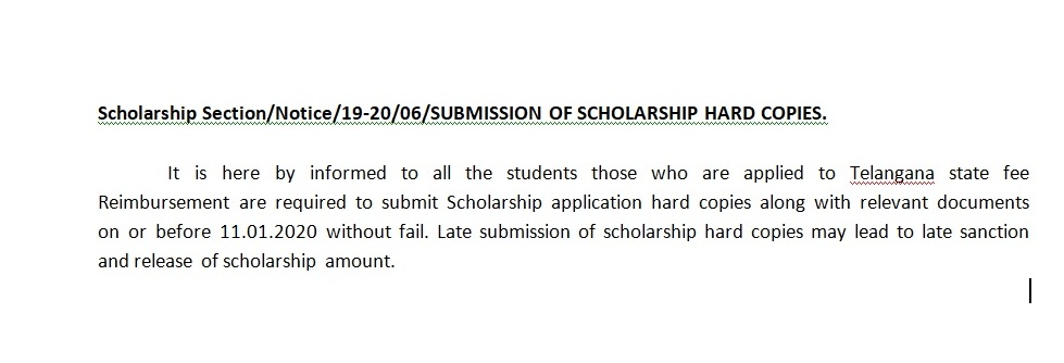 It is here by informed to all the students those who are applied to Telangana state fee Reimbursement are required to submit Scholarship application hard copies along with relevant documents on or before 11.01.2020 without fail. Late submission of scholarship hard copies may lead to late sanction and release of scholarship amount.