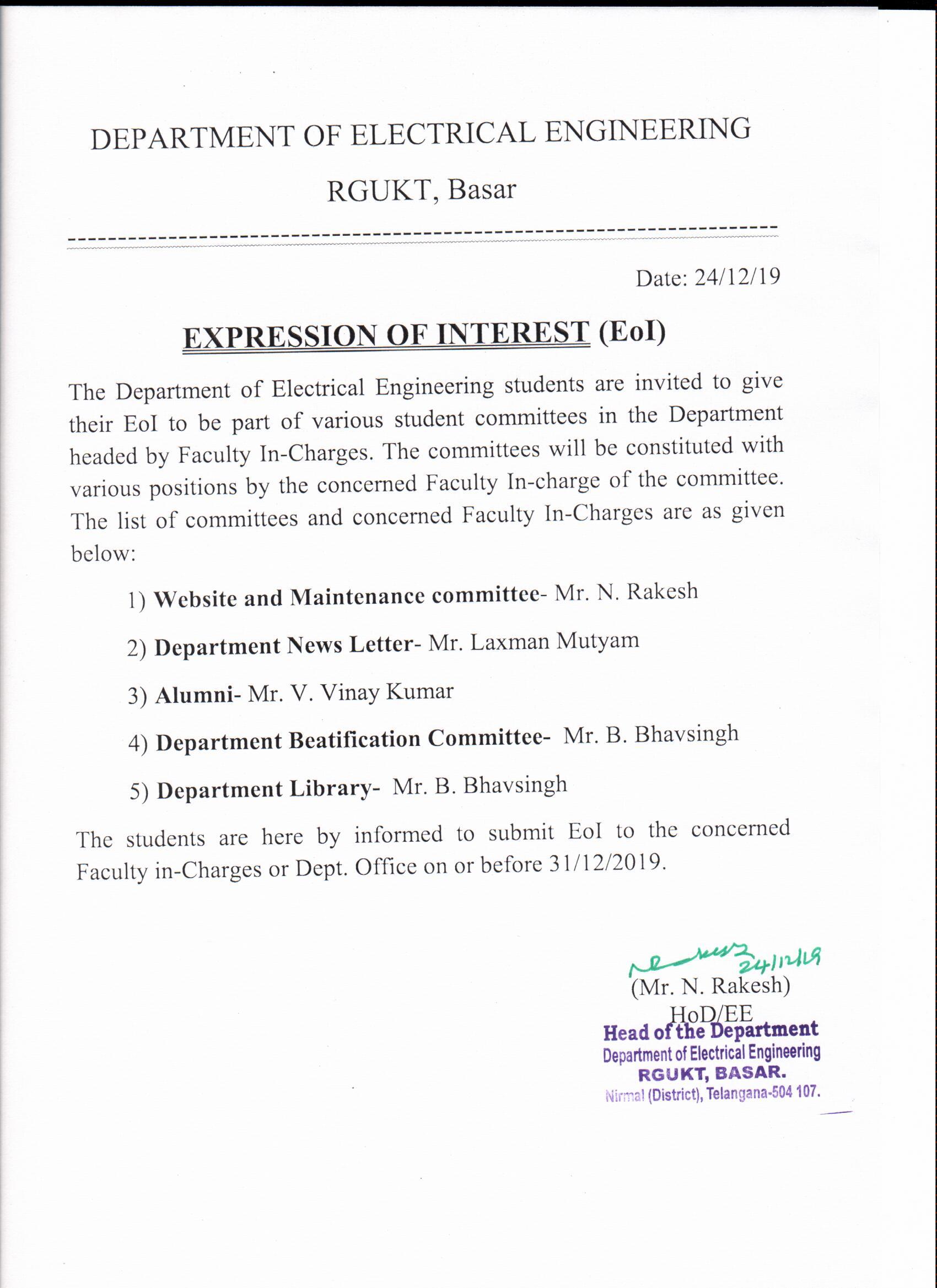 The Department of Electrical Engineering invites Expression of Interest (EoI) for Departmental student committees.