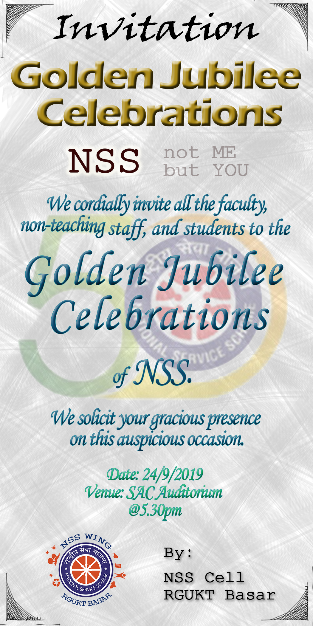 We cordially invite all the faculty, non-teaching staff, and students to the Golden Jubilee Celebrations of NSS.