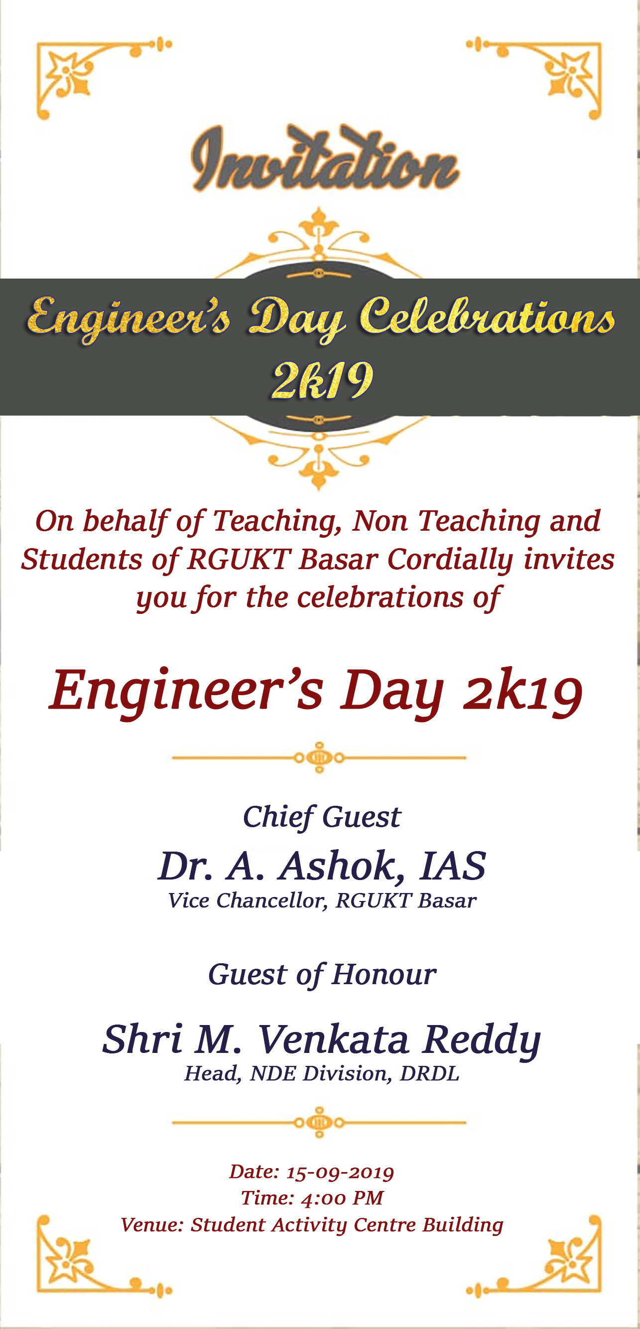As you are well aware, Engineers’ Day is celebrated on September 15 every year in India commemorating the birthday of one of the greatest engineers in India so far and a great human being Sir Mokshagundam Visvesvarayya. The University is celebrating the “Engineers Day” on September 15th, 2019 (Sunday) with a theme “Engineering for Change”.